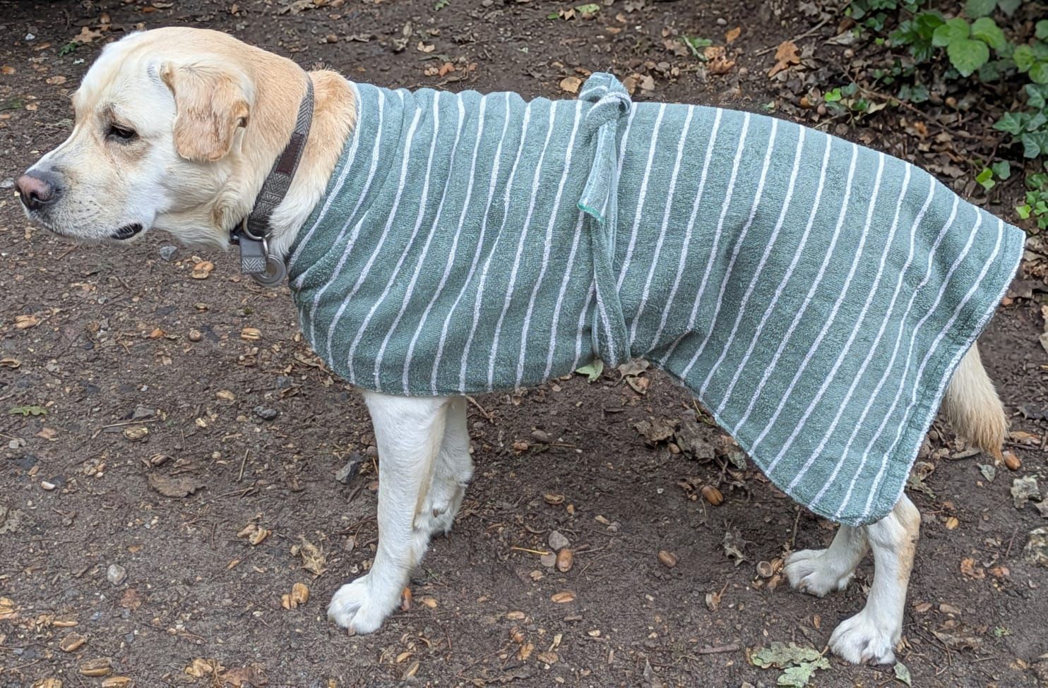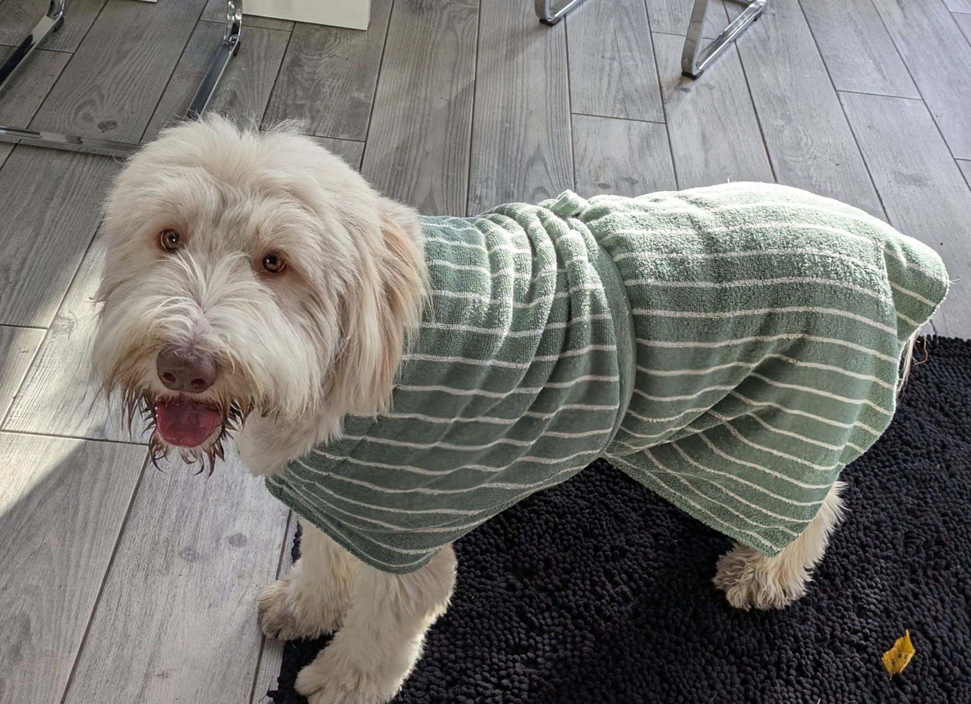 Our handmade towelling robes are crafted from recycled and up-cycled towels, giving them a second life while keeping your dog warm and dry after walks, swims, or bath time.